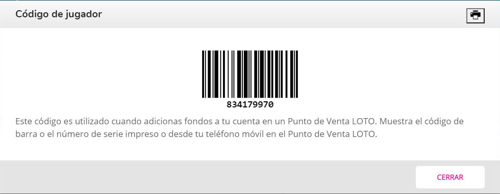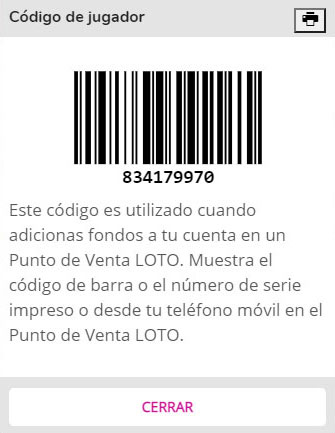 - Con este código podrás adicionar fondos a tu cuenta en un Punto de Venta LOTO. Muestra el código de barra o el número de serie impreso o desde tu teléfono móvil en el Punto de Venta LOTO.