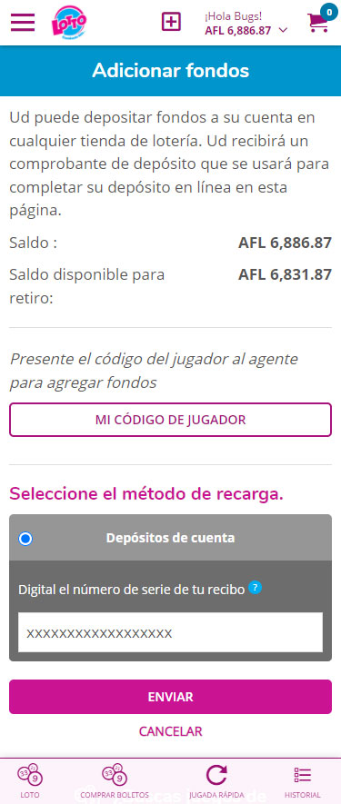 - Digite el número de serie de su voucher de depósito de LOTO Saldo.
