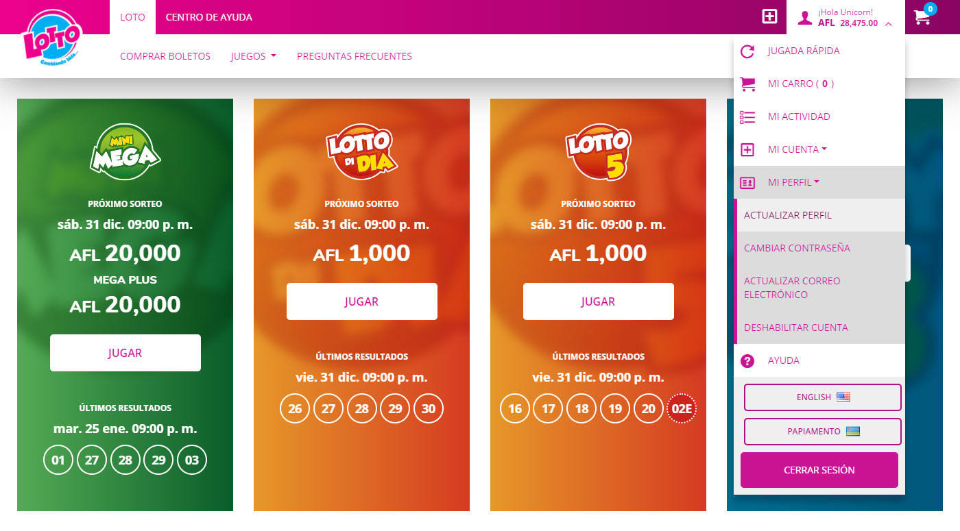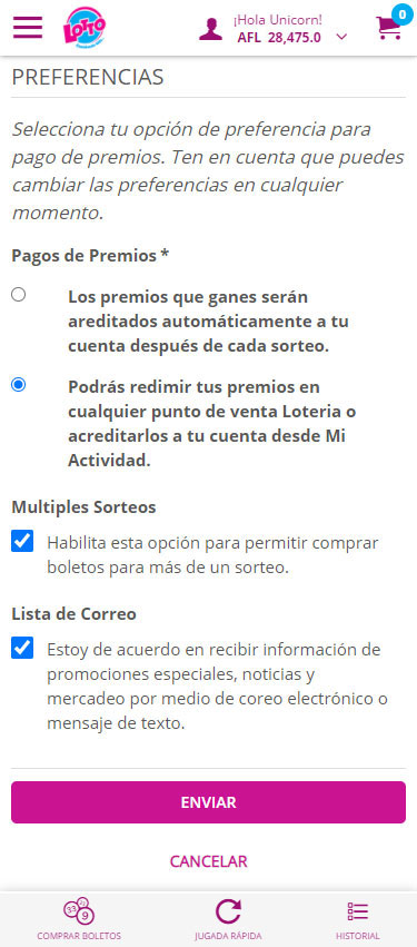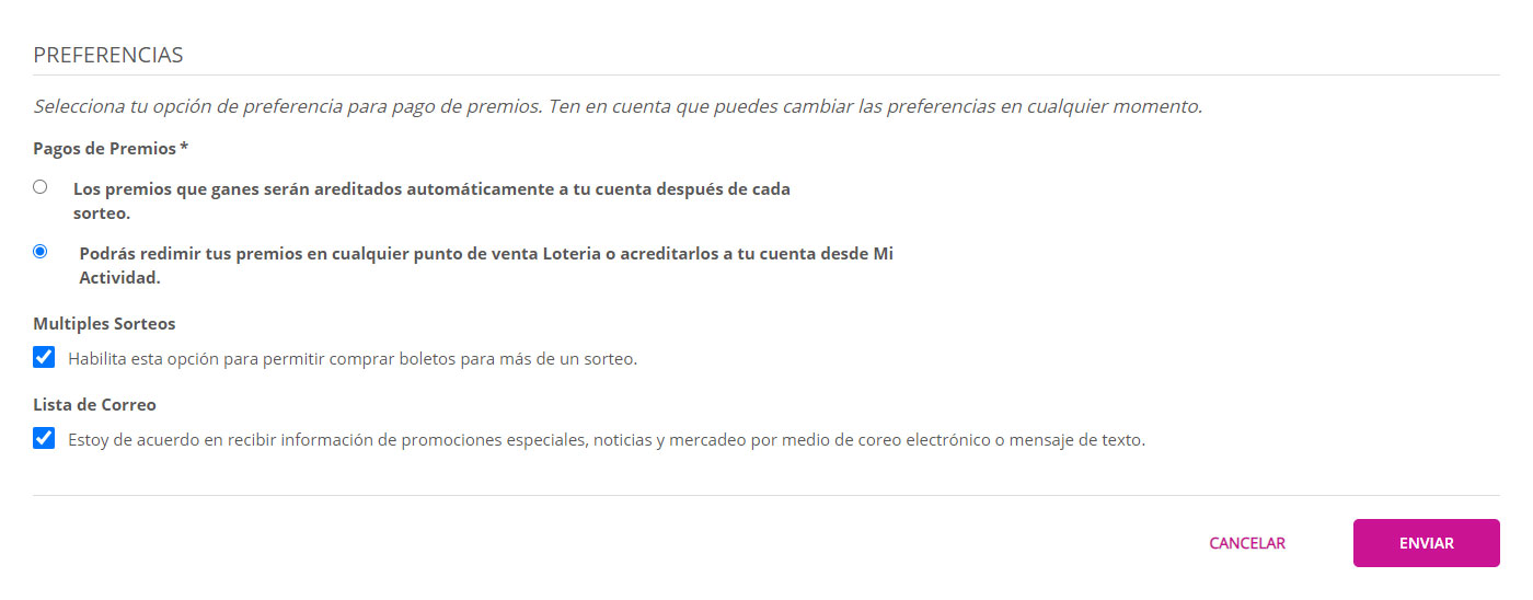 - Desde esta pantalla puedes actualizar tu información personal,dirección información de contacto y preferencias para el pago de premios. También puedes decidir entrar o salir de la lista de correo.