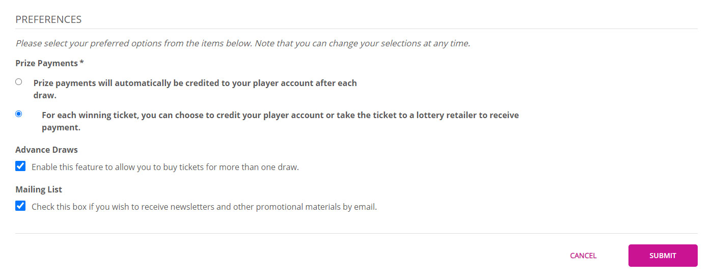 - From this screen you can update your personal information, address, contact information, and prize payment preferences. You can also opt in or out of the mailing list.